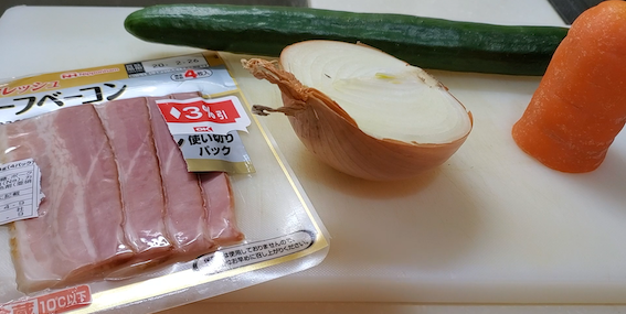 きゅうりは一旦放置して、玉ねぎ、人参、ベーコンを切っていきます。